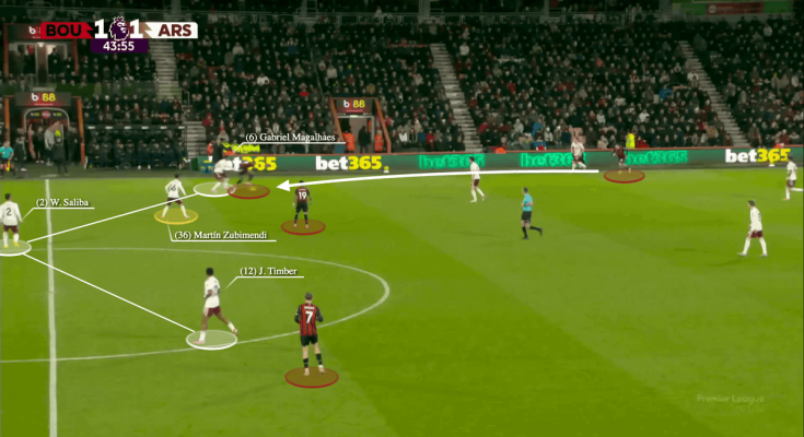 In a second instance, from a 2-1 home win over Wolverhampton Wanderers in December, on 48 minutes, Bukayo Saka, who was double-marked, slipped through right-back Jurrien Timber on the underlap.